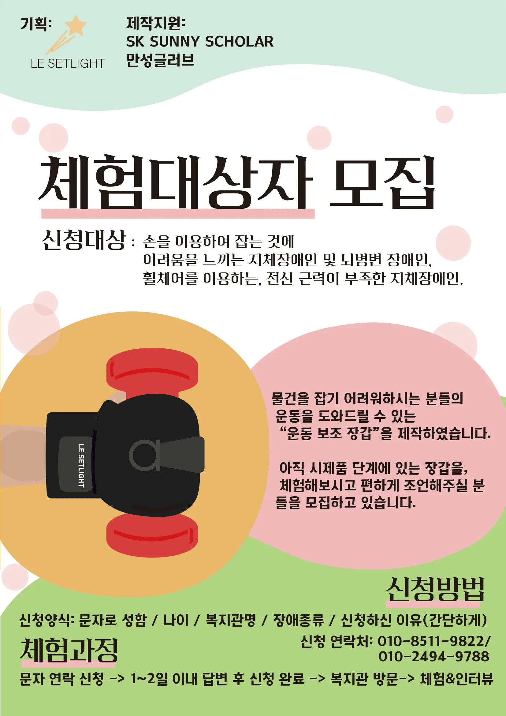 처음부터 하지장애인의 운동을 돕고자 합리적인 가격의 재활보조장갑을 만들려던 것은 아니었어요. 팀원 모두 건강 문제에 관심이 많았고, 우리 나이 또래의 청년이 겪는 건강문제가 무엇이 있을까 찾아보다가 청년 당뇨 환자가 급격하게 증가하고 있다는 사실을 발견했습니다. 당뇨문제에 대해 더 찾아보니 장애인의 당뇨 발병률이 2배 이상인 것을 확인하였고, 이후 이 부분을 운동 부족의 관점으로 파고들면서, 저희가 접근해 가장 큰 임팩트를 가져갈 수 있는 본 주제를 선택하게 되었어요.