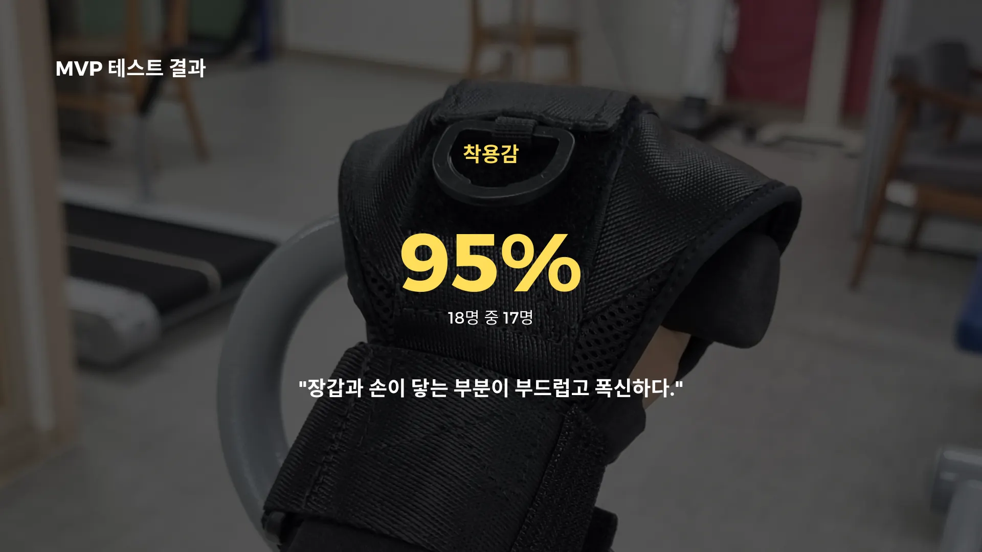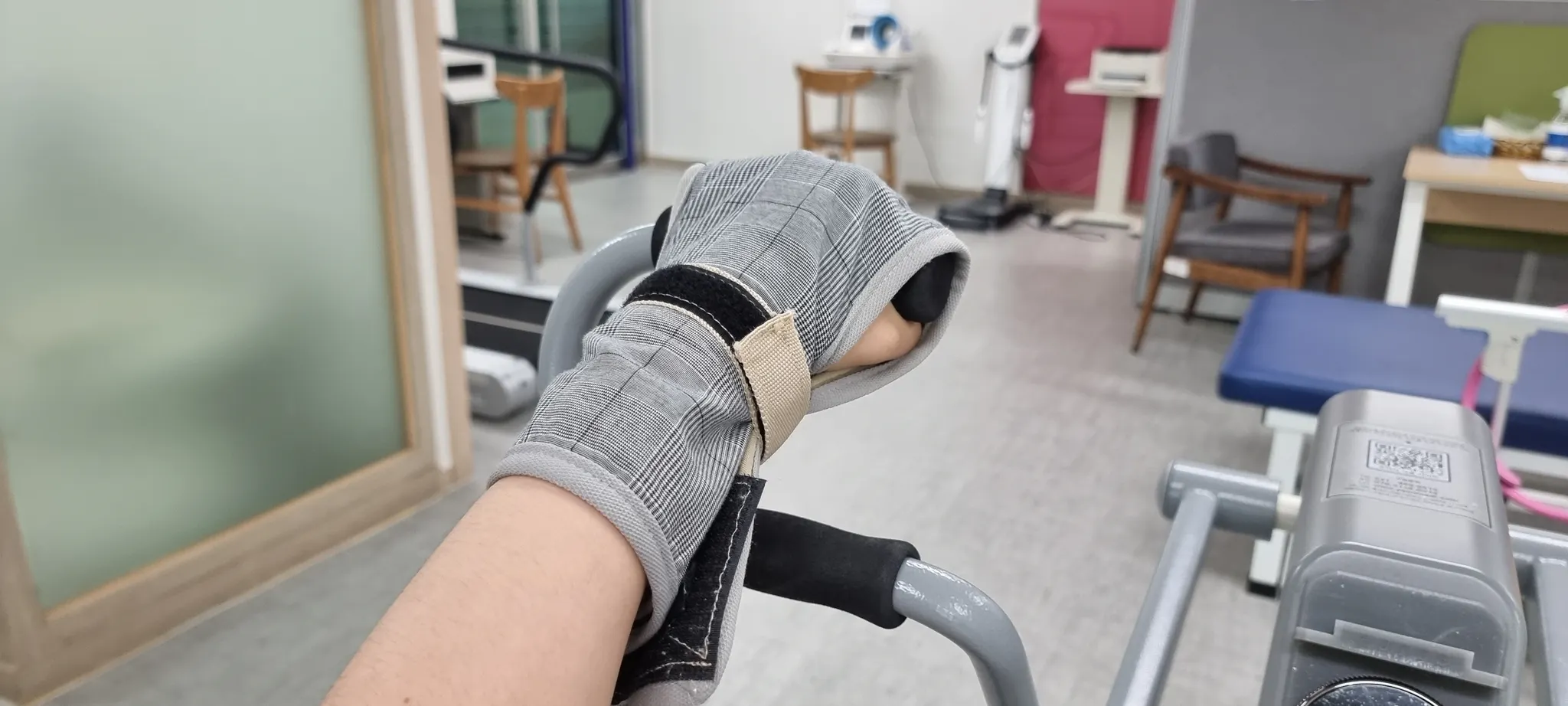 : (시중의 저렴한 재활보조장갑(단순히 천으로 손을 감싸는 손싸개)은 대부분 가지고 있지만, 손이 쓸리고 고정이 잘 안되어 운동을 잘 하지 않는 것을 확인했다.) 재활보조장갑을 통해 손목과 손을 단단하게 고정 시켜주어 운동 시 피부의 불필요한 마찰을 줄여주는 것이 중요한 영향을 미치는 것을 확인했다.