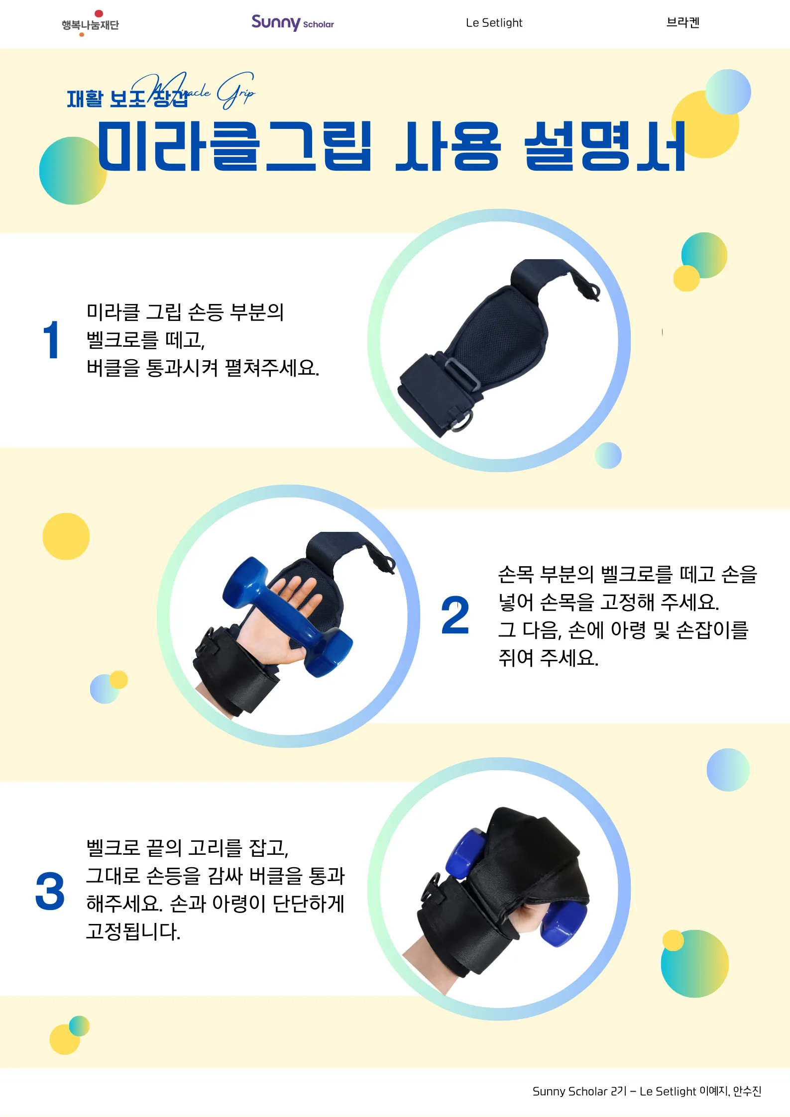 운동 시 손을 안전하게 고정하는 장갑이 필요한 장애인들에게 기존의 장갑보다 더 저렴하고 품질(안정성, 내구성 향상)이 개선된 장갑 (Solution)을 제공하여, 운동 시의 부상 위험과 운동 어려움, 운동 장소의 제한 (Problem)을 줄였습니다. ‘미라클 그립’을 통해 장애인이 더 잘 운동할 수 있는 환경(Impact)을 제공해 주고자 합니다.