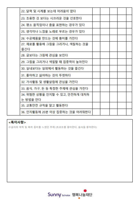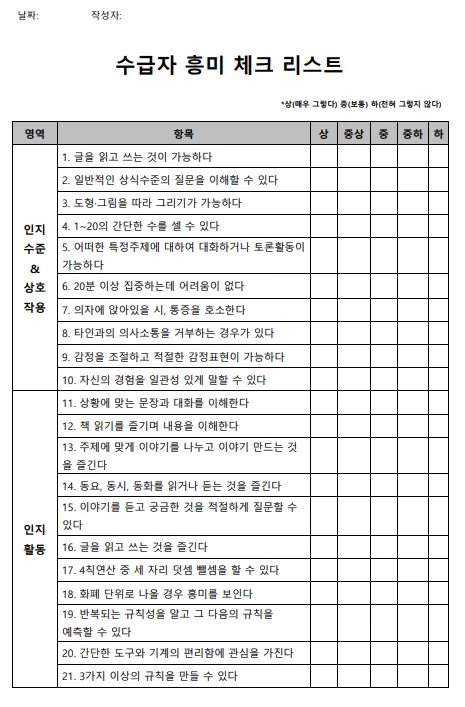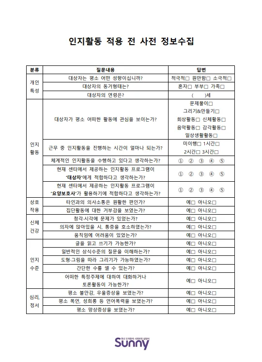 해당 체크리스트로는 어르신의 구체적인 인지수준과 선호도를 파악하는 것이 어려워 적합한 학습지 제공이 불가능할 것으로 판단