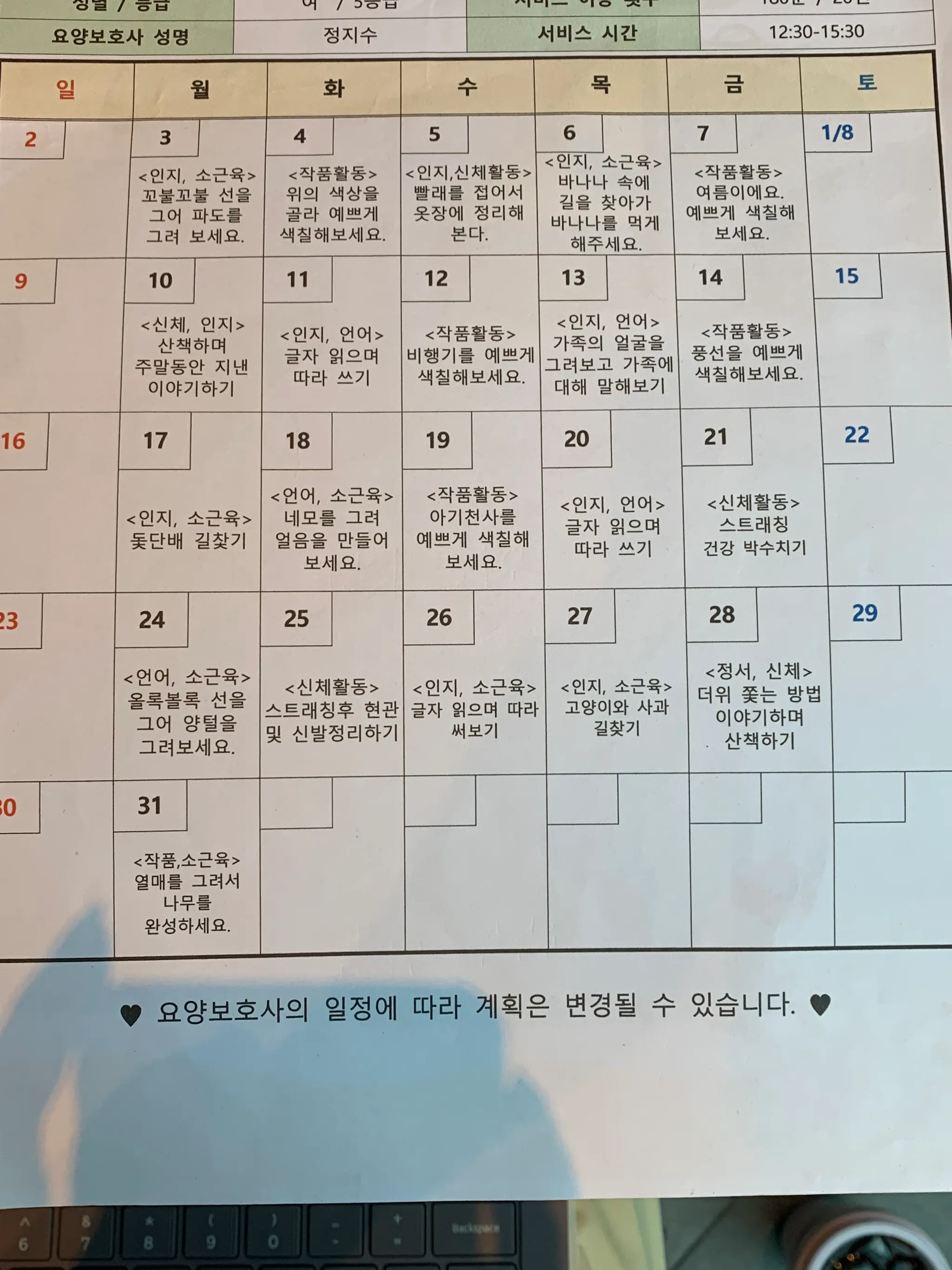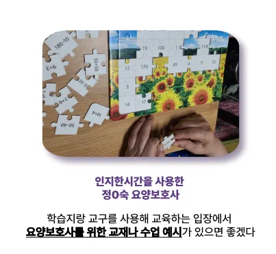 5등급 수급자에게 인지활동은 국가에서 지정할 정도로 꼭 필요한 과정이었습니다. 또한 방문요양보호사에게도 본인의 돌봄전문성을 보여줄 기회이기도 합니다.