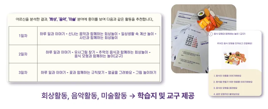 어르신의 흥미에 맞춰 실제 프로그램 학습지 및 교구를 제작하여 제공