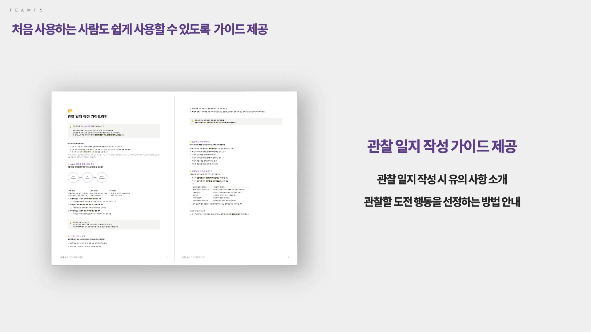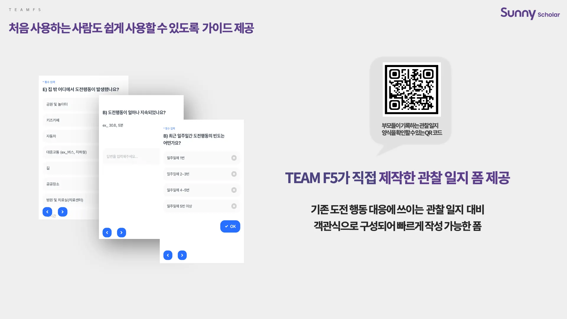 F5는 초반 타겟과 솔루션을 좁고 구체적으로 설정했습니다. 행동중재치료(ABA 치료)를 받고 있거나 받을 예정인 미취학 발달장애아동을 둔 부모를 타겟으로, 중재 이전 단계인 도전행동 원인 파악을 솔루션으로 잡았습니다.