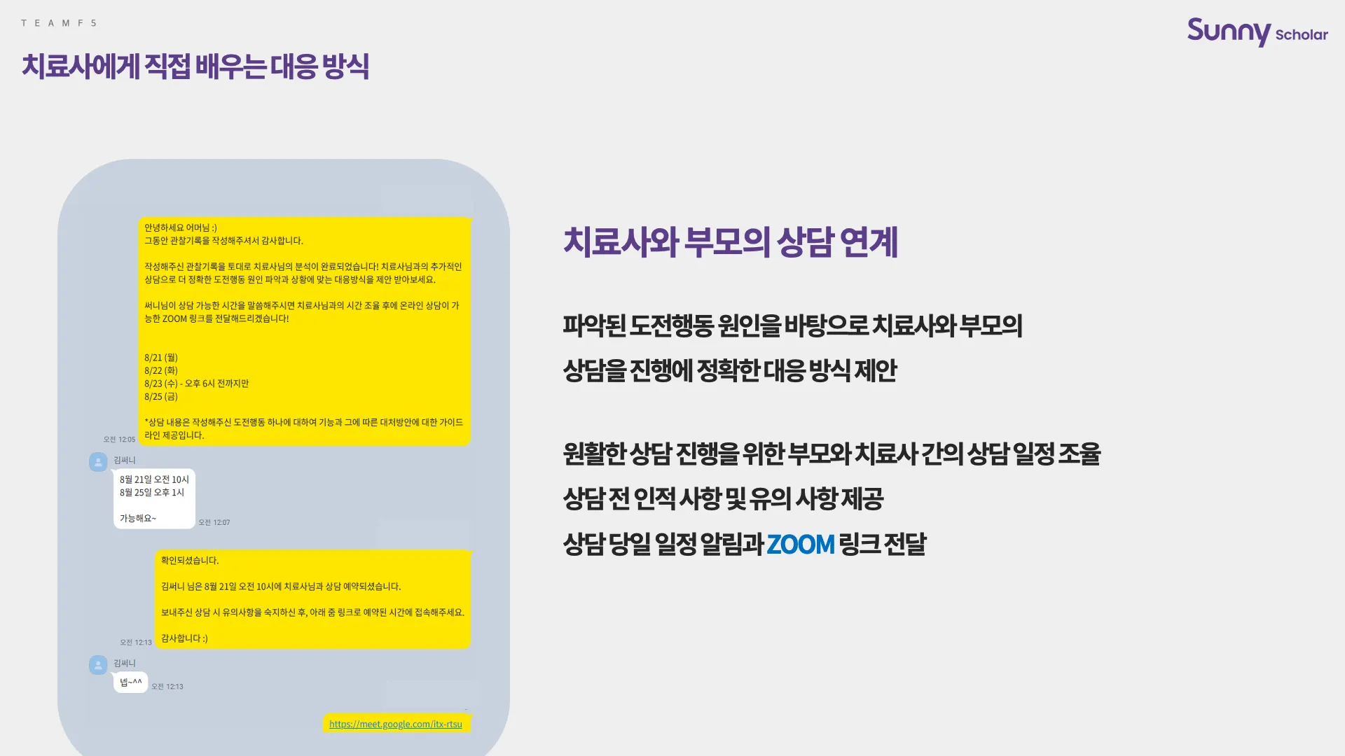 이 과정 속에서 발달장애아동 부모에게 더욱 효과적인 솔루션을 만들기 위해 중재에 대한 방식 제안이 필요하다는 결론을 도출했습니다. 이를 위해 초기에는 중재 사례 제시를 통한 솔루션 보충을 생각했으나 개별성이 도드라지는 발달장애의 특성과 중재 방안에 대한 전문성이라는 문제를 확인하여, 최종적으로 치료사 상담 연계라는 서비스를 추가하게 되었습니다.