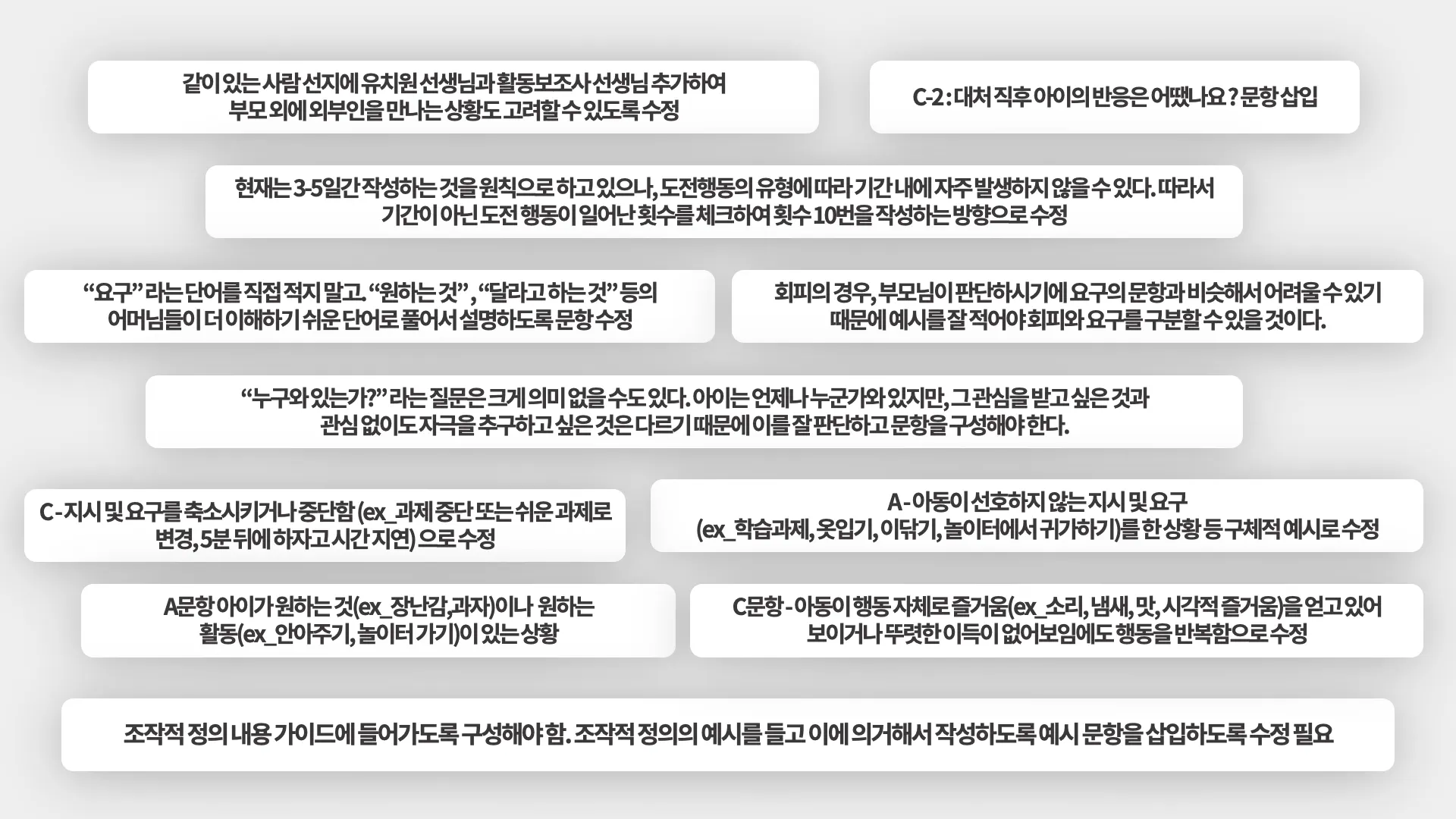 각 ABC 문항을 어떻게 서술해야하는지에 대한 안내가 부재해 부모들의 구체적인 응답이 어렵습니다.