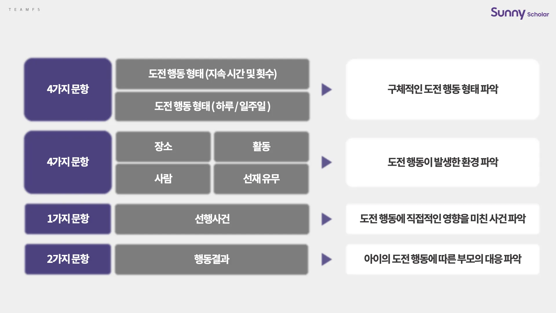 도전행동을 관찰하고 기록할 때는 최대한 구체적으로 꾸준히 작성하는 것이 중요한데, 평균 17시간의 돌봄 시간을 감당하는 발달장애아동 부모에게 서술형 응답 방식의 일지는 작성 피로도 및 부담감을 유발합니다.