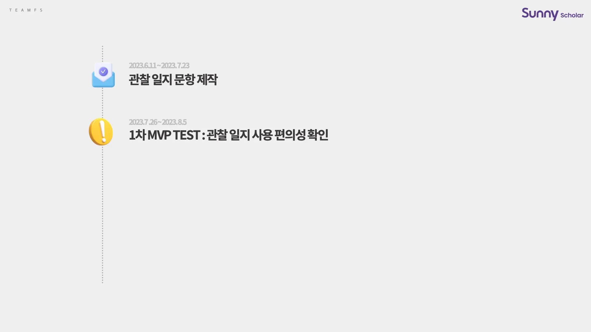 관찰 일지 작성 시간 최대 2분 | 1차 MVP TEST 를 통해 부모의 작성 시간 1분 내외임을 확인 | 약 100% | 기존의 관찰 일지와 달리 객관식으로 응답할 수 있는 방식으로 제작했기 때문에 부모들이 빠르고 쉽게 작성할 수 있었습니다. |