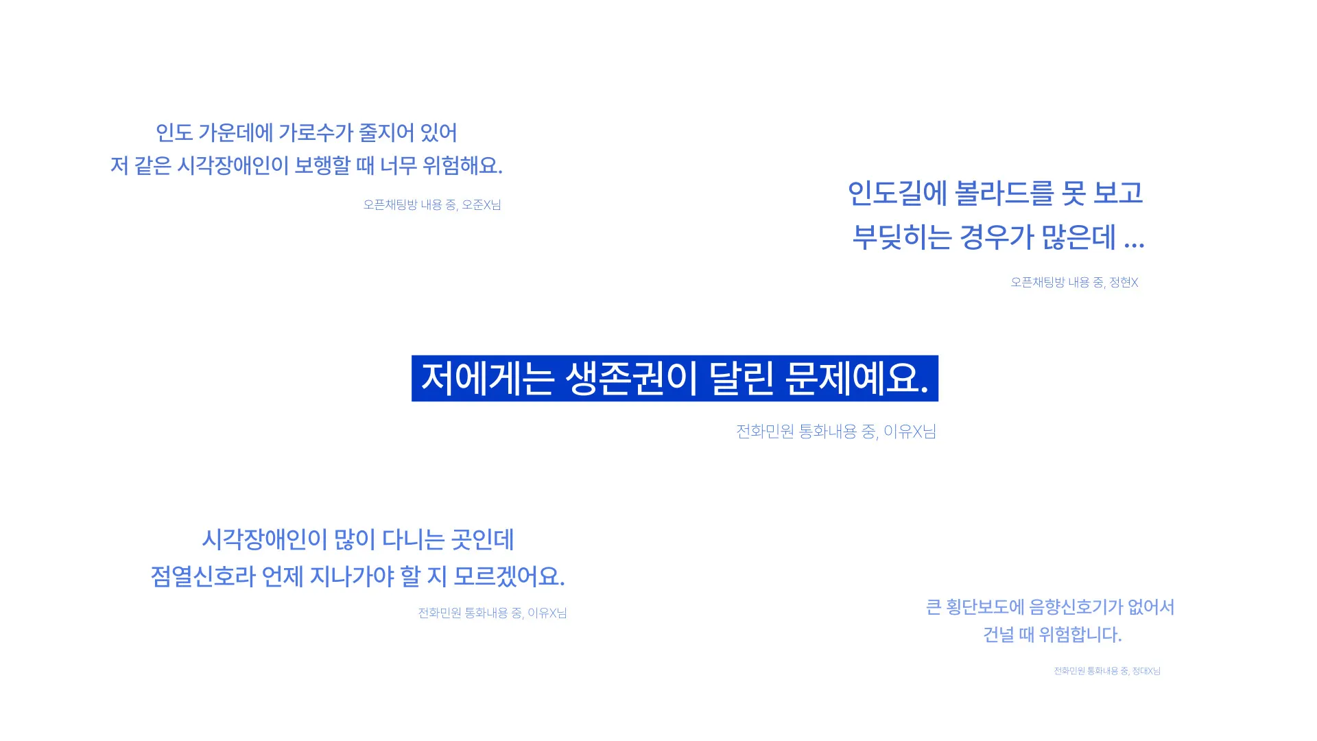 결국, 민원서비스 역시 강성민원과 그렇지 않은 민원에 대한 대응 메뉴얼이 다르다는 인사이트를 얻을 수 있었는데요, 이러한 인사이트를 바탕으로 단순히 민원을 대신 넣어드리는 것에 그치지 않고 진정으로 시각장애인이 겪는 도보 불편을 해결할 수 있는 서비스 설계가 필요하다는 사실을 깨달았습니다.