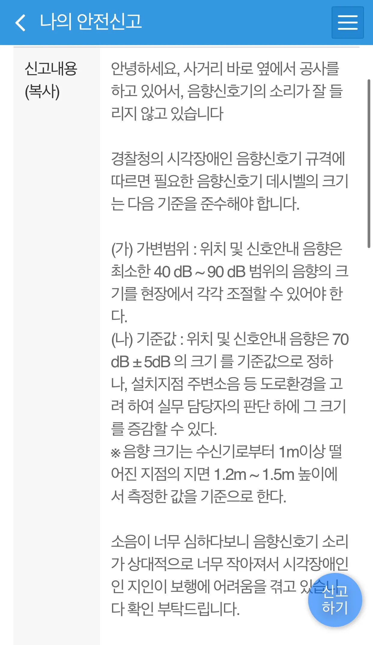 음향신호기의 소리가 작아서 보행이 어렵다는 시각장애인의 민원을 대행한 결과, 타기관으로 민원이 이송되고 단계가 진척되지 않아서 음향신호기 규격에 따라 데시벨의 기준을 준수해야 한다는 증거를 첨부하여 다시 민원을 넣었던 적이 있었어요.이 경우 3일 만에 음향신호기가 불량으로 확인되어 교체하여 정비 완료까지 되었다는 처리 결과를 받았습니다.